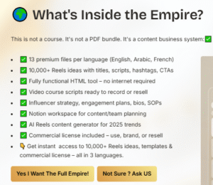 The **Instagram Reels Empire** is a comprehensive framework designed to help creators dominate short-form video. It combines proven content strategies, ready-made assets, and AI-powered tools so you never run out of viral ideas. Instead of scrambling for topics, you’ll tap into a library of 10,000 Reels prompts, scripts, and templates optimized for the 2025 algorithm.