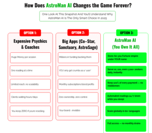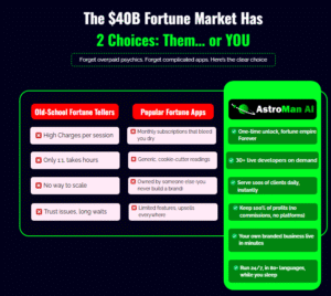 Whether you’ve tried e-commerce or affiliate marketing, AstroMan AI opens a low-competition path into fortune-telling automation.
