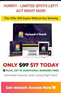 Upload n’Bank is available at a special price of $17 today. With a 180-day money-back guarantee, there’s zero risk in trying out the system.If you’re unhappy with the outcome, you can receive a full refund—no hassle.