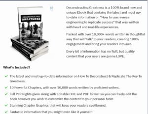 The “Deconstructing Greatness PLR” package provides a step-by-step guide to deconstructing success strategies. Here’s how it works: