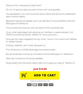 If you’re looking for a cost-effective, powerful solution to automate customer interactions and drive business growth, TalkFlow AI is an excellent choice. The limited-time price of $14.95 makes it a low-risk opportunity to harness the future of Conversational AI.